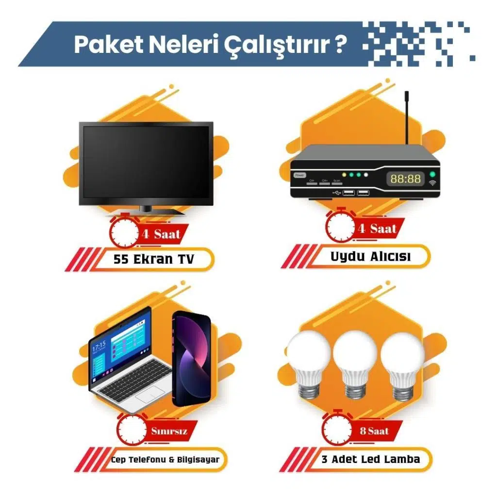 Elektriğe ulaşımın olmadığı her ortamda televizyon izleme, aydınlatma ve şarj ihtiyaçlarınızı karşılamak için ideal bir güneş enerjisi çözümüdür. Bağ evi, yayla, kamp ve sahil gibi alanlarda güvenle kullanılabilir.