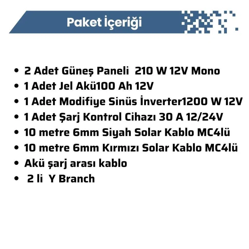 • 1 Adet 100Ah 12V Jel Akü (Bakım gerektirmez, uzun ömürlü)