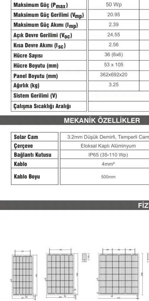 Modül Ölçüleri (mm) | : | 362x692x20 |
