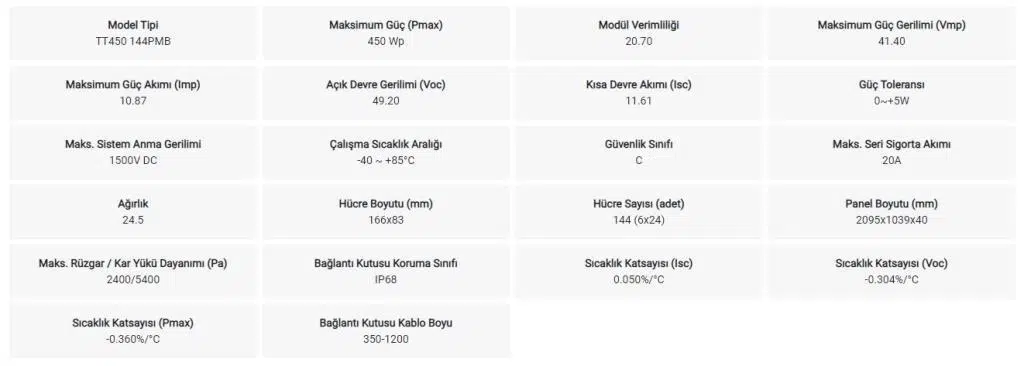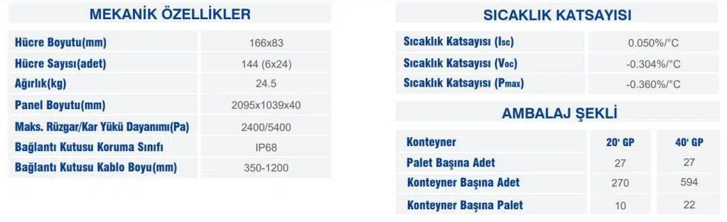 Sıcaklık katsayısı (Voc): -0,304 %/°C