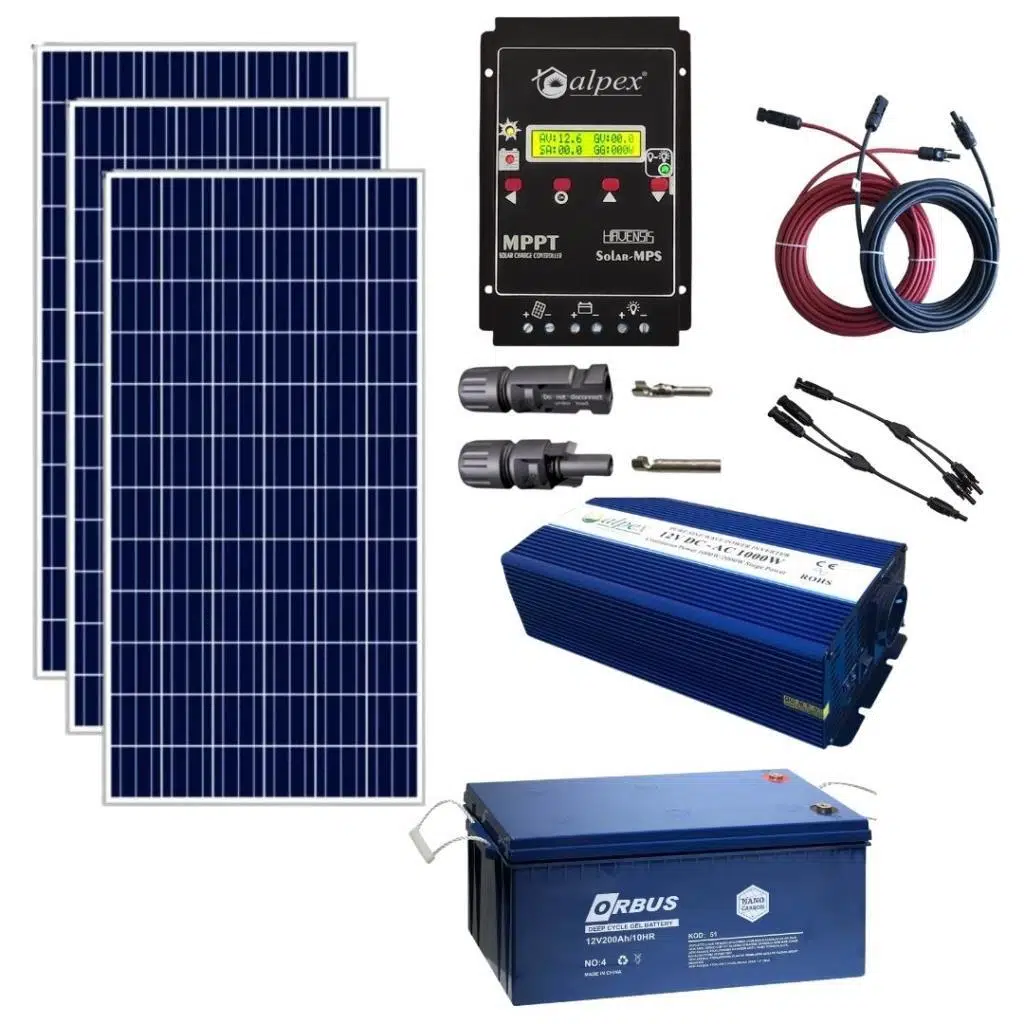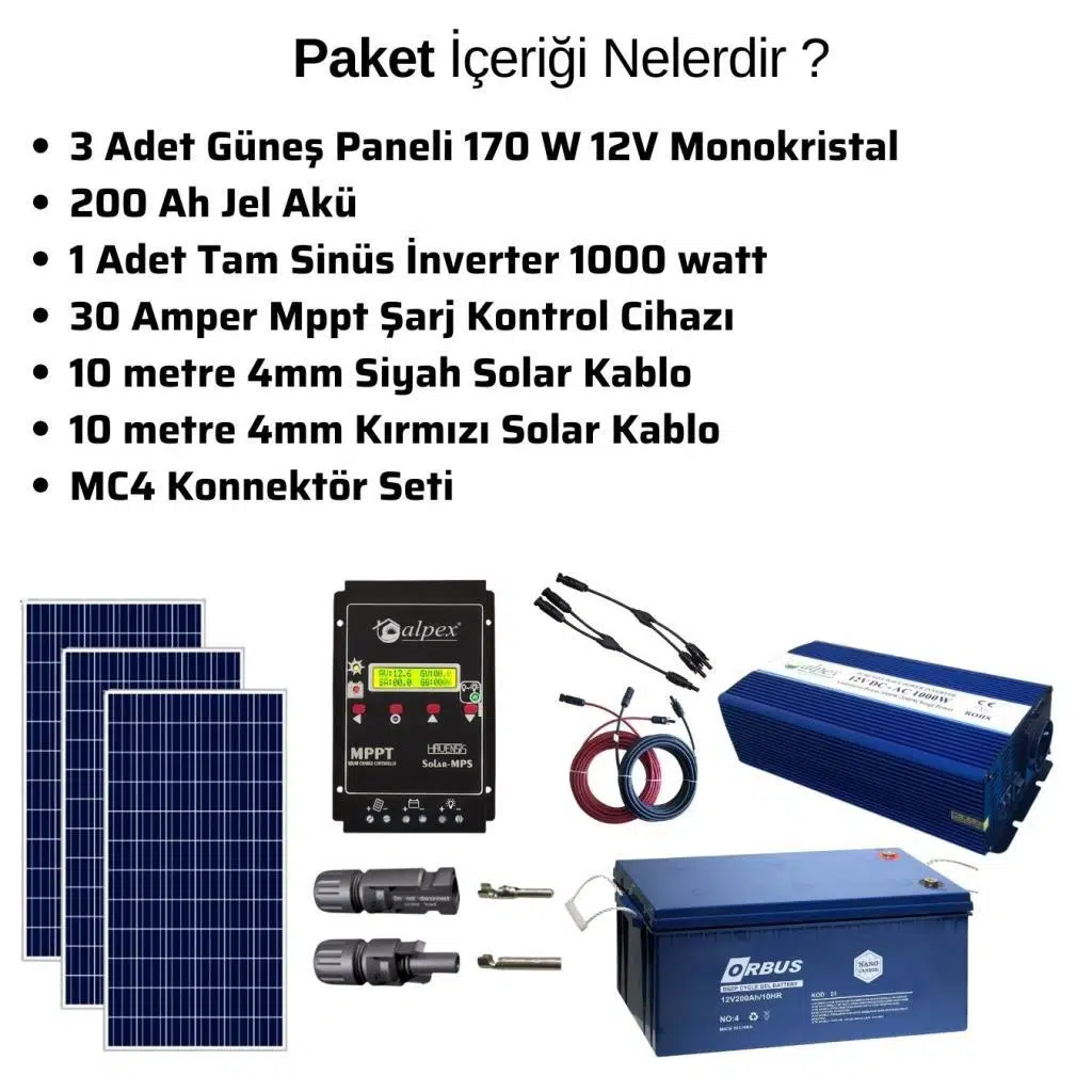 Güneş Enerjisi Bağ Evi Solar Paketi 1000W Tam Sinüs İnverter 250W 12V Güneş Paneli 200Ah Jel Akü