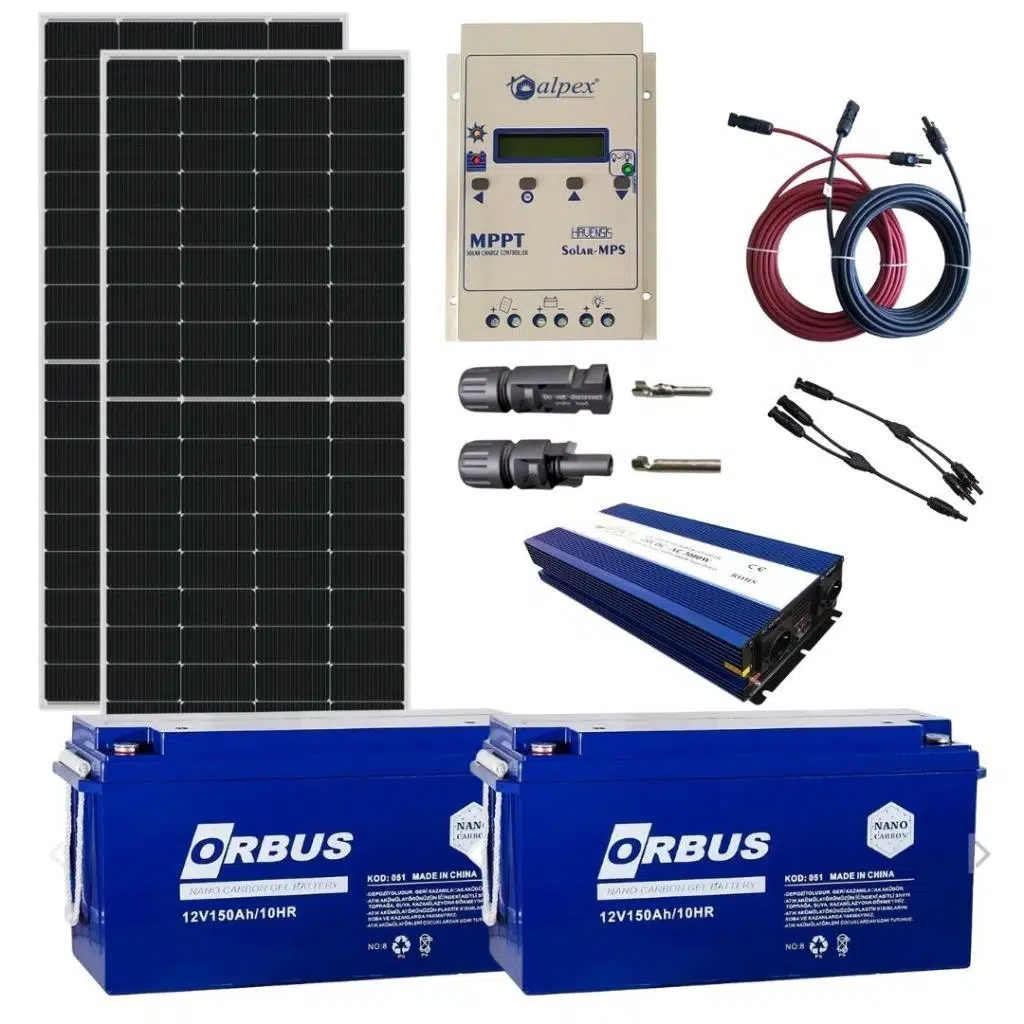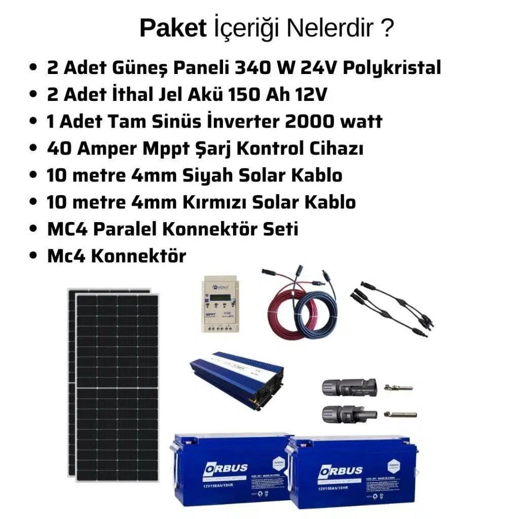 Güneş Enerjisi Bağ Evi Solar Paketi – 2000W Tam Sinüs İnverter, 2x340W Güneş Paneli, 2x150Ah Jel Akü