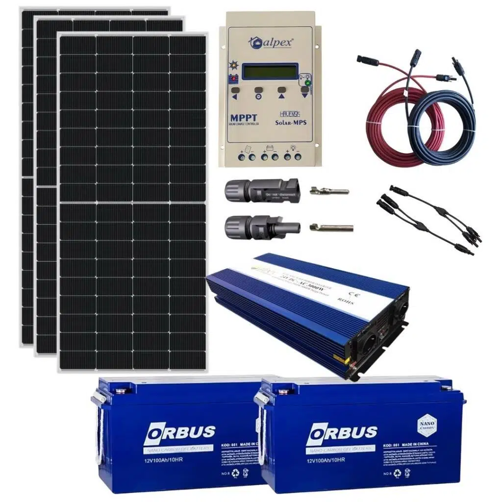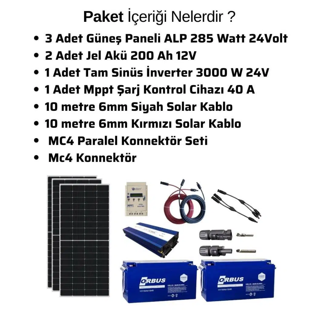 Güneş Enerjisi Bağ Evi Solar Paketi – 3000W 24V Tam Sinüs İnverter, 3x285W Güneş Paneli, 2x200Ah Jel Akü
