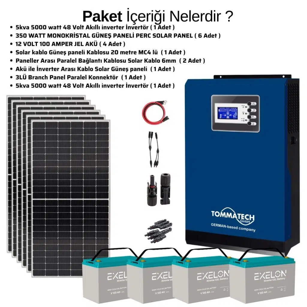 Bu sistem, 5.000W’a kadar enerji üretme kapasitesine sahiptir. Günlük enerji ihtiyacınızı doğrudan güneşten karşılayarak elektrik faturalarınızı düşürür ve çevre dostu bir yaşam sunar.
