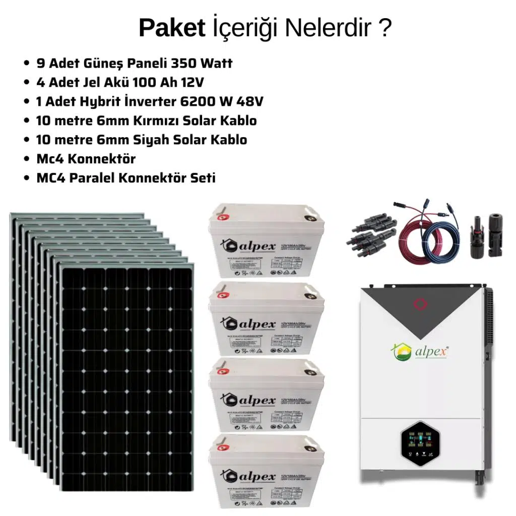 Güneş Enerjisi Bağ Evi Solar Paketi 6.2kW Hibrit İnverter 410W Panel & 100Ah Jel Akü