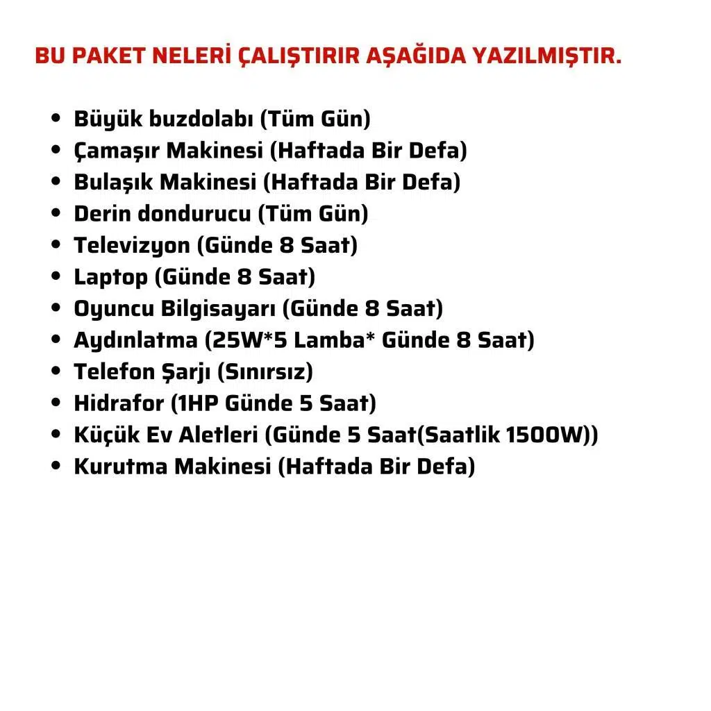 Ev tipi yüksek kapasiteli enerji ihtiyaçlarını karşılamak üzere tasarlanmış bu sistem, günlük hayatınızda ihtiyaç duyduğunuz pek çok cihazı güneş enerjisiyle kesintisiz çalıştırmanızı sağlar. Bağ evi, yayla, müstakil ev ya da şebeke dışı alanlar için ideal ve sürdürülebilir bir çözümdür.