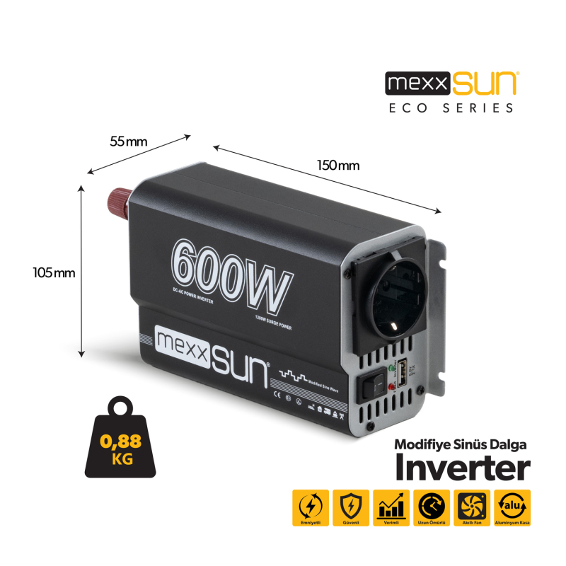 MexxSun 600W Modifiye Sinüs Inverter, ekonomik bir fiyatla kaliteden ödün vermeden, günlük hayatta ihtiyaç duyacağınız enerji çözümlerini sunar. İster evde, ister yolda, enerji ihtiyacınız her zaman güvende. MexxSun ile enerjinizi doğru kullanın, yaşamınıza değer katın!