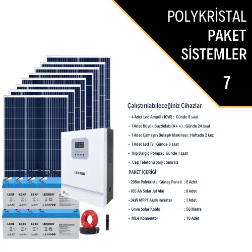 Elektrik altyapısının olmadığı orta ve büyük ölçekli bağ evleri için geliştirilen bu güneş enerjisi paketi, günlük yaşamda ihtiyaç duyulan birçok cihazı rahatlıkla çalıştırabilecek kapasitededir. 3kW MPPT akıllı inverter, yüksek kapasiteli jel aküler ve 8 adet 295W polikristal panel ile uzun süreli ve dengeli enerji sağlar.