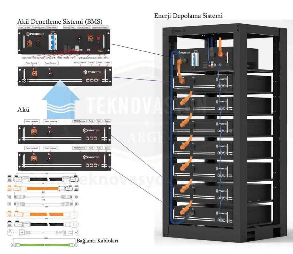 Paket içerisinde BMS ünitesi, metal taban braket, RJ45 iletişim kablosu, topraklama kablosu, güç kabloları ve montaj aksesuarları yer almaktadır.