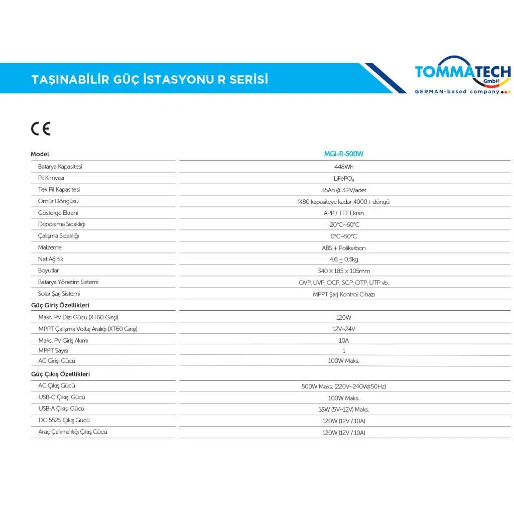 TommaTech MGI-R-500W, kompakt tasarımı, güçlü batarya kapasitesi ve LiFePO₄ hücre teknolojisi ile kamp, karavan, acil durum ve mobil enerji ihtiyaçlarınız için mükemmel bir çözümdür. 4000+ döngü ömrü, TFT ekranı, çoklu çıkış desteği ve MPPT solar şarj sistemi ile enerji özgürlüğü sunar.