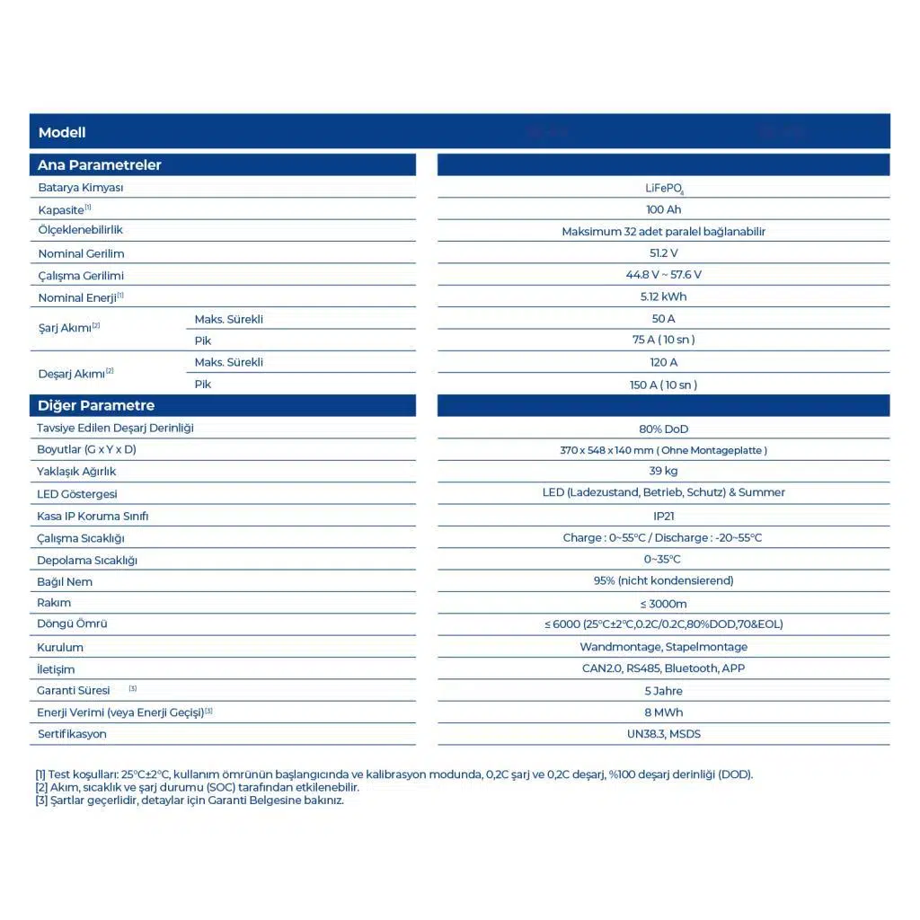 • Kimya / Nominal Gerilim: LiFePO₄ (LFP) • 51.2 V