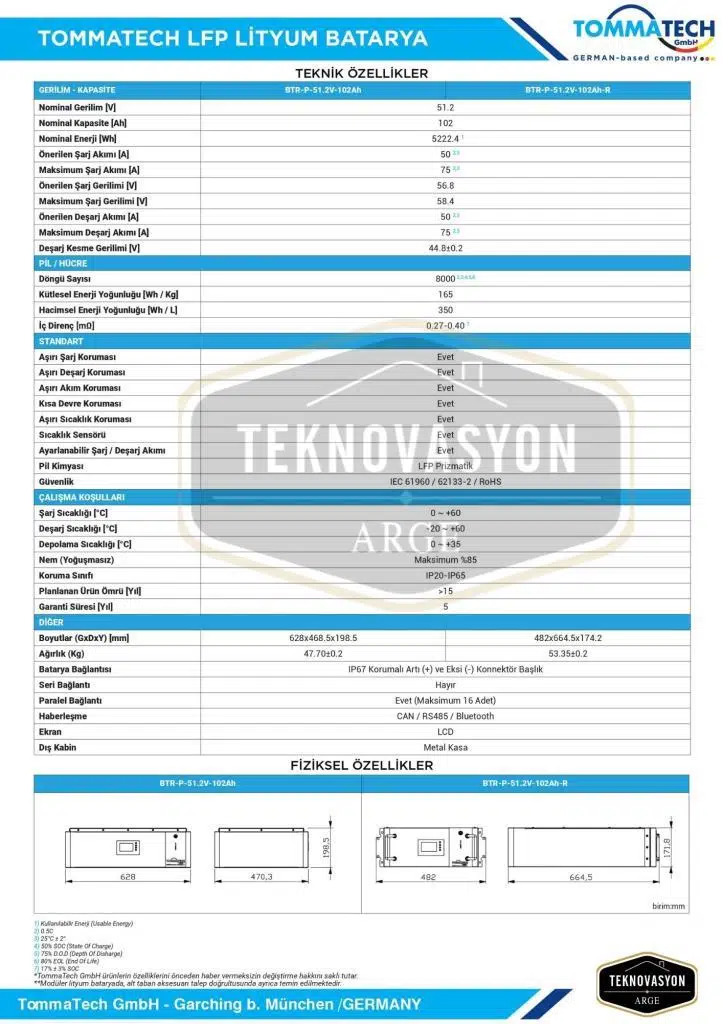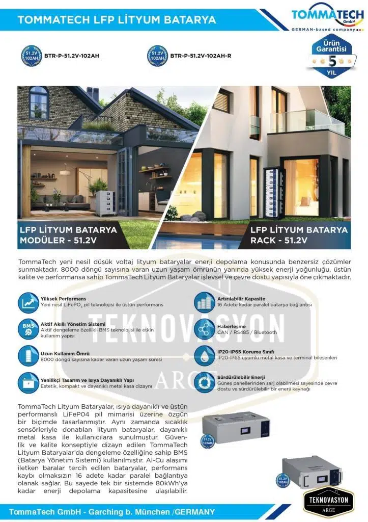 | Etiketler | TommaTech Modüler Serisi 51.2V 102AH G2 LFP Lityum Batarya |