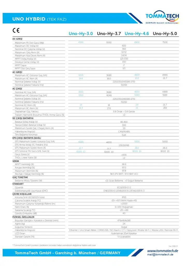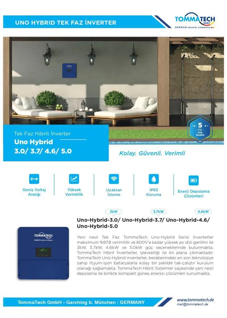 Yeni nesil tek fazlı TommaTech Uno-Hybrid serisi inverterler maksimum %97.8 verimlilik ve 600V’a kadar yüksek pv dizi gerilimi ile 3kW, 3.7 kW, 4.6 kW ve 5.0 Kw güç seçeneklerinde bulunmakta. 3 farklı çalışma moduna sahip olan hibrit inverterler işlevselliği ile ön plana çıkmaktadır. TommaTech Uno-Hibrid inverterler, beraberindeki en son teknolojiye sahip lityum-iyon bataryalarla kolay bir şekilde tak-çalıştır kurulum olanağı sağlamakta. TommaTech hibrit sistemler sayesinde yeni nesil depolama ile birlikte kompakt güneş enerjisi çözümleri sunulmakta.